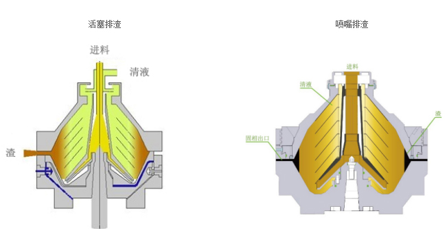 電機通過螺旋齒輪副驅動轉鼓繞主軸軸線做高速旋轉,在轉鼓內形成強大的離心力場。物料由上部中心進料管流入轉鼓底部,通過碟片分流孔趨向轉鼓壁空間。在離心力作用下,液相沿碟片內錐面趨向轉鼓壁流動至上部的出液口排出。比液相重的固相物沉積向轉鼓內壁形成沉渣,由排渣裝置自動排出機外或停機后由人工清除。