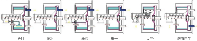 電機帶動皮帶輪驅動轉鼓繞自身軸線高速回轉,反沖管向虹吸室內灌液排除虹吸管內的空氣,物料在預先編制的程序控制下,通過進料系統進入高速旋轉的轉鼓內。在離心力和虹吸抽離的雙重作用下,物料均布在過濾介質上進行脫液分離,液相透過固相物料和濾網縫隙,經過濾內轉鼓壁孔和虹吸室的通孔進入虹吸室,再由虹吸管抽走排出機外,固相物料截留在過濾轉鼓內形成濾餅。料層檢測裝置實時檢測物料的充填位置,當濾餅達到事先設定的位置時,自動關閉加料閥,停止進料,然后對濾餅進行洗滌、脫水,待達到要求后,離心機降到卸料速度,卸料閥打開,刮料器在液動控制下旋轉上升,將濾餅刮下掉進螺旋出料器,經出料閥排出機外。